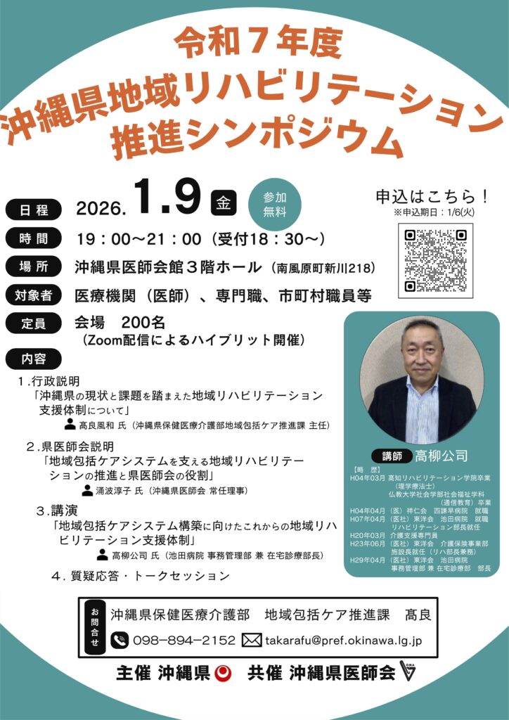 【講習案内】沖縄県地域リハビリテーション推進シンポジウム 2025年12月15日 最終更新日時 : 2025年12月15日 okinawa_risen 閲覧した人数: 15 日時:2026年 1 月 9 日(金) 19:00~21:00(受付18:30~) 場所:沖縄県医師会館 3Fホール(南風原町新川218) 講師:高柳 公司 氏 (池田病院 事務管理部 兼 在宅診療部長) 高良 風和(沖縄県保健医療介護部 地域包括ケア推進課 主任) 涌波 淳子(沖縄県医師会 常任理事) 対象:医療機関(医師)専門職、市町村職員 定員:会場200名(Zoom配信によるハイブリット開催) 参加費:無料 締切:2026年1月6日(火) 申込 Follow me! FacebookXHatenaPocketCopy
